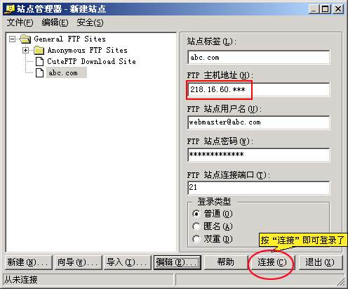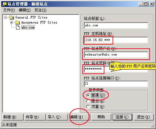 3、然后在右邊對話框中輸入站點標(biāo)簽(如abc.com),輸入主機地址,用戶名,密碼和登錄類型要選擇“普通”,輸入完成后,點擊下面菜單欄的“編輯”,界面如下: